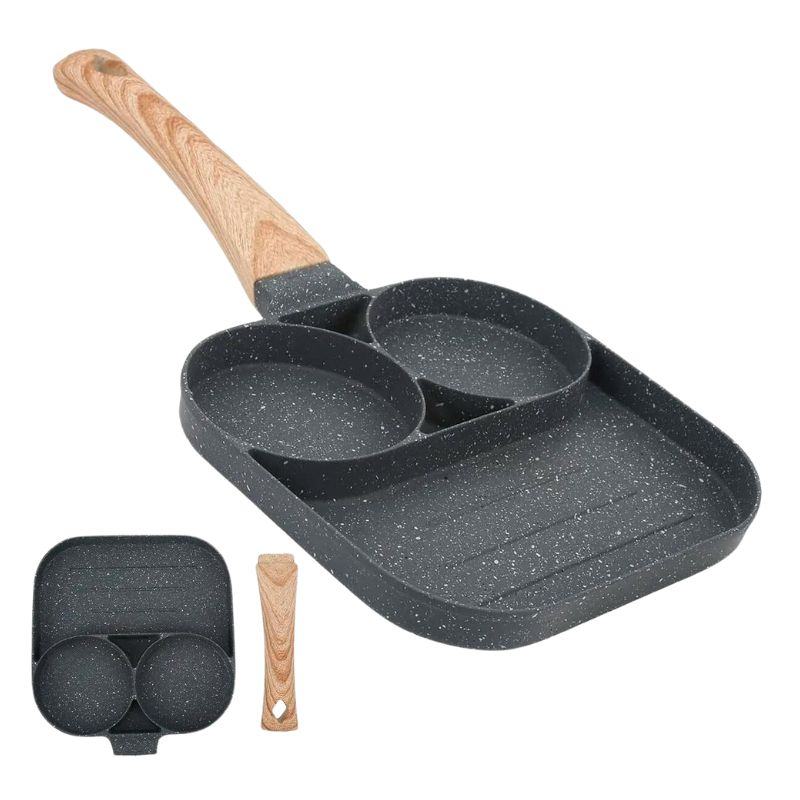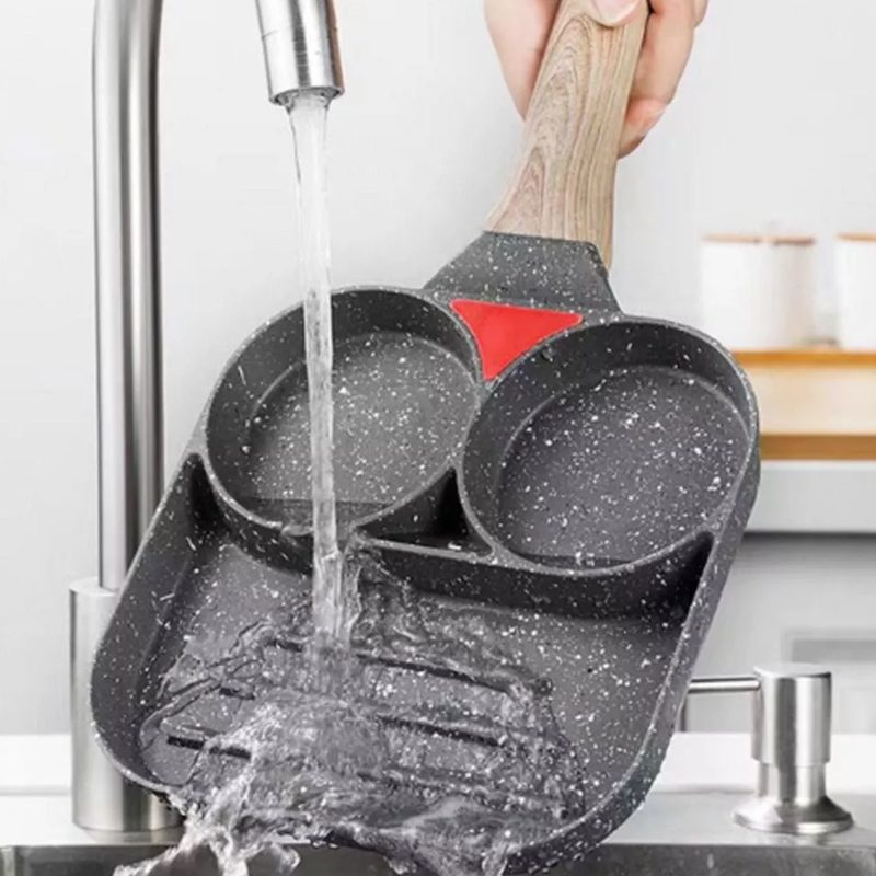 Dividida en 3 secciones antiadherentes, evita que tus comidas se mezclen en un desastre culinario. ✨ Mango frío cool-touch (chau quemaduras), funciona en gas e inducción y se limpia en segundos. Menos lavado, más placer.
